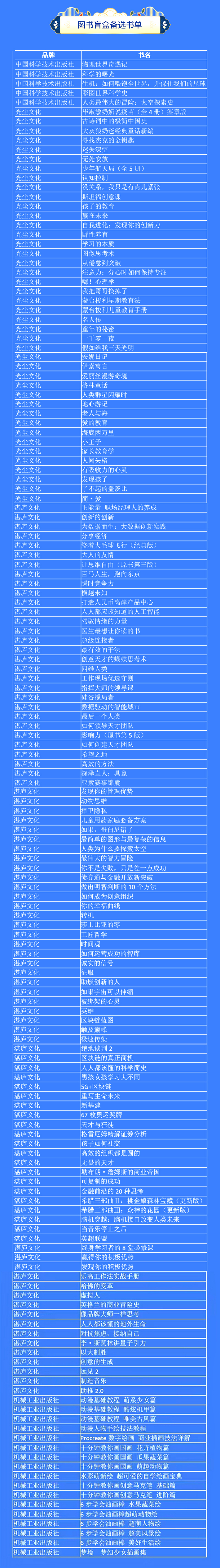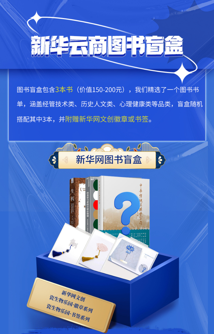 本次活動(dòng)由新華云商聯(lián)合機(jī)械工業(yè)出版社、中國(guó)科學(xué)技術(shù)出版社、光塵文化、湛廬文化共同推出。盲盒內(nèi)圖書涵蓋經(jīng)管技術(shù)類、歷史人文類、心理健康類等品類,將隨機(jī)搭配三本,可能與您的藏書重復(fù),或不符合您的閱讀愛(ài)好,請(qǐng)您慎重選擇理性購(gòu)買。同時(shí),盲盒內(nèi)會(huì)附贈(zèng)新華網(wǎng)文創(chuàng)徽章或書簽。