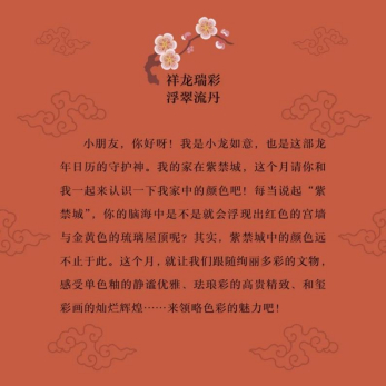 媽媽告訴如意,這是一個(gè)“時(shí)光寶盒”,里面有來(lái)自故宮不同領(lǐng)域的10位專(zhuān)家從故宮館藏中精選的262件“龍”文物,它們每天登場(chǎng)介紹自己的故事,還會(huì)請(qǐng)小讀者幫忙,每日動(dòng)手給日歷中的小龍如意卷軸貼出一身漂亮的龍鱗。