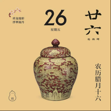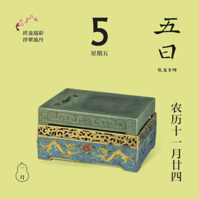 翻開(kāi)1月月份頁(yè),首先跳入眼簾的,是主題詞“祥龍瑞彩”。這個(gè)月以絢麗的顏色為主線(xiàn),串起各色龍文物,比如精致的宋代單色釉龍紋盤(pán),絢麗的故宮官式建筑和璽彩畫(huà),還有優(yōu)雅的清代掐絲琺瑯游龍花卉紋瓜式蓋罐……
