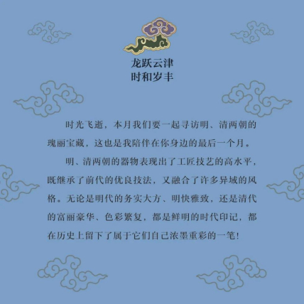 最后,兒童版《故宮日歷》編纂組要感謝來(lái)自故宮博物院器物部、書(shū)畫(huà)部、古建部和宮廷歷史部的專(zhuān)家們,大家共同祈愿2024年里的每一天,小讀者們都能跟著日歷中的故宮龍文物,了解歷史文化,欣賞國(guó)寶之美,學(xué)習(xí)中華“龍”文化傳承的點(diǎn)滴,見(jiàn)證自己一整年的成長(zhǎng)足跡!