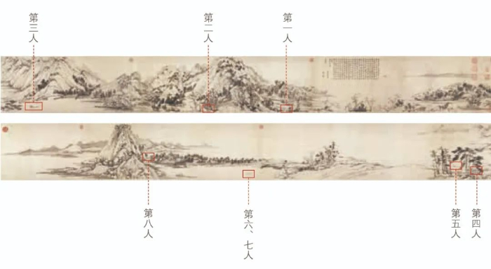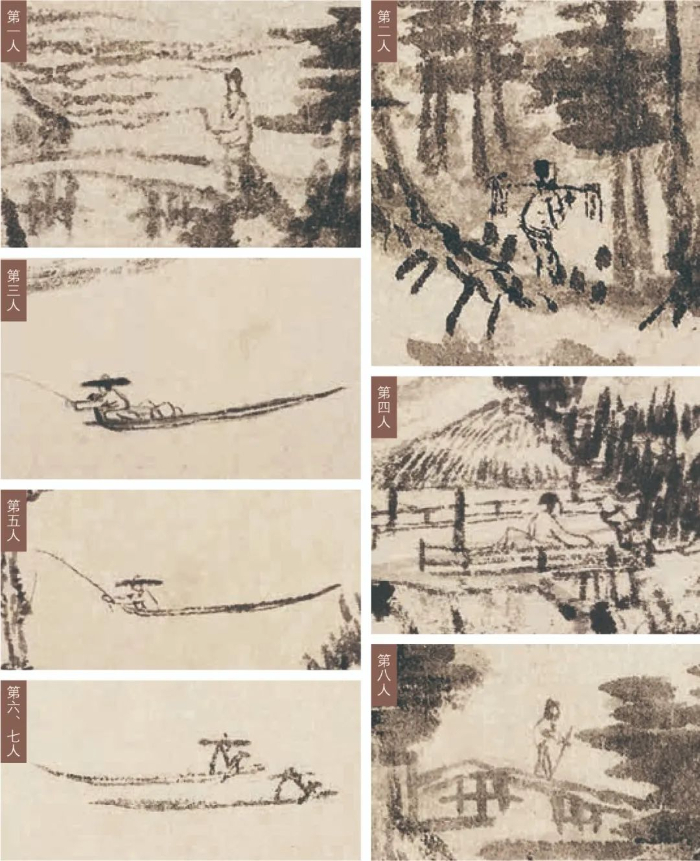 說第九位人物之前,我們先來看看上圖展示的已經(jīng)形成共識的八位人物。從形象上看,這八位人物大概為高士、樵夫和漁父。詳細解讀這八位人物之前,我們不妨先一起找尋一下隱藏的第九位神秘人物。