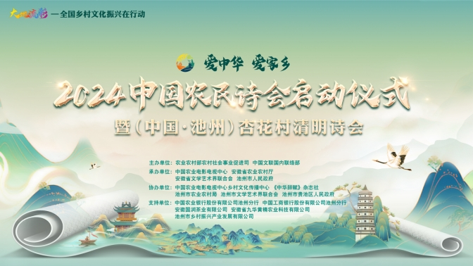 大地流彩,詩賦“三農(nóng)”。3月31日,“大地流彩—全國鄉(xiāng)村文化振興在行動”重點活動“愛中華愛家鄉(xiāng)”2024中國農(nóng)民詩會啟動儀式暨(中國·池州)杏花村清明詩會在安徽池州杏花村文化旅游區(qū)舉辦,主題為“春和景明詩出池州”。本次活動由農(nóng)業(yè)農(nóng)村部農(nóng)村社會事業(yè)促進司、中國文聯(lián)國內(nèi)聯(lián)絡部主辦,中國農(nóng)業(yè)電影電視中心、安徽省農(nóng)業(yè)農(nóng)村廳、安徽省文學藝術(shù)界聯(lián)合會、池州市人民政府承辦。