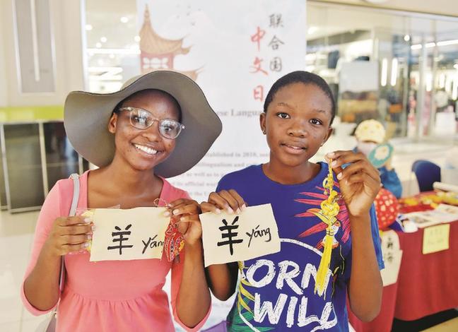 20日,孩子們在博茨瓦納哈博羅內(nèi)舉行的中文日慶祝活動上展示漢字。 新華社發(fā)