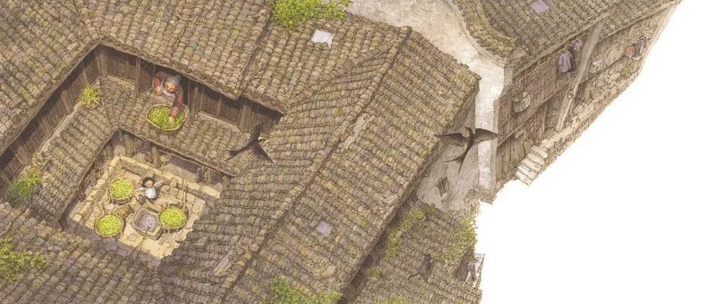 整個繪本主要采用寫實性的現(xiàn)實主義風格,繪畫者付出極大的耐心和精力,用鋼筆和馬克筆細致描繪每一片磚瓦、每一塊石板、每一叢花葉、每一扇門窗,甚至每一條木紋、每一絲波紋、每一道皺紋……力求真實地呈現(xiàn)物像的肌理和質(zhì)感,讓人身臨其境。同時,也加以寫意的手法,用柔和的淡彩渲染懷舊的色調(diào)和溫馨的氛圍。尤其值得稱道的是,在多幅畫面中,以丫丫等待的“神秘的客人”——燕子為一種符號角色,無論之于畫面還是主旨,都有其獨到的意義。燕子飛翔于水面和屋宇之上,給靜態(tài)的環(huán)境帶來靈動之感,有時還能平衡畫面的結(jié)構(gòu)。燕子是江南春天的使者,也是童年喜愛的精靈。蘇軾和歐陽修各自的《蝶戀花》詞中都寫到了燕子,前者是:“花褪殘紅青杏小。燕子飛時,綠水人家繞。”后者是:“畫閣歸來春又晚。燕子雙飛,柳軟桃花淺。”這一古典意象在繪本畫面中的反復出現(xiàn),羽翼間展開了江南的典雅、清麗以及輕愁。作品里的另一種動物是時??M繞主人腳邊的貓咪,增添了祥和的家居趣味,也代表一種熟稔的情感皈依。原本黑瓦白墻的江南民居在畫面中作為背景或前景,灰中帶彩、冷中帶暖,既體現(xiàn)了時間的流逝,也象征著永恒的家園。外公背著丫丫雨夜歸家的場景以多個連貫畫面變換角度來鋪展,暗夜中始終有溫暖的燈光照亮回家的路,也有堅實的后背托舉稚嫩的夢,給孩子以安全、安穩(wěn)和安心。