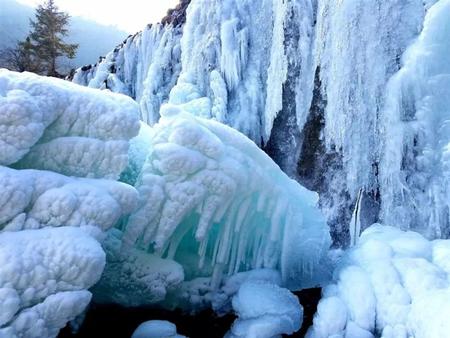 往前走,山和山之間的天顯得窄小了,抬頭,并沒有鷹飛過。懸崖峭壁上是一簾簾冰掛冰瀑,老天爺最寫意的畫作,是用白水晶,羊脂玉做成的。心里沸騰著歡喜,眼睛卻被這世界上最純凈的光芒刺出了淚,這凝固的千堆雪,這些白玉蘭,這些合歡樹,對嗎?不對。這些冰瀑,站在遠(yuǎn)處和近處看到的物像都不相同,正面和側(cè)面觀看,更是形態(tài)各異。