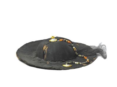 這一頂鑲寶石鈸笠帽,可要豪華貴重得多,這是一頂帽頂垂有一串玉石珠串飾的帽子,帽的直徑有35厘米?!洞笤湔隆吩涊d有人搶走蔡國(guó)祥懸有紅瑪瑙珠串的棕帽的事??梢?jiàn)帽上垂串飾也是元代貴族的風(fēng)氣。這種帽子的流行始于元成宗大德年間(1297—1307),一個(gè)商人賣(mài)給官府一塊紅剌子(紅寶石)重一兩三錢(qián),用于鑲嵌帽頂。從此以后,歷代皇帝相承。凡元旦及天壽節(jié)大朝賀時(shí)都戴這種鈸笠帽。漳縣元代汪世顯墓出土的這頂鈸笠帽,帽頂鑲金裹玉,由帽頂垂系31顆珠玉組成的串練。以珠玉寶石來(lái)裝飾帽子,帽子的價(jià)值之高昂自不待言。