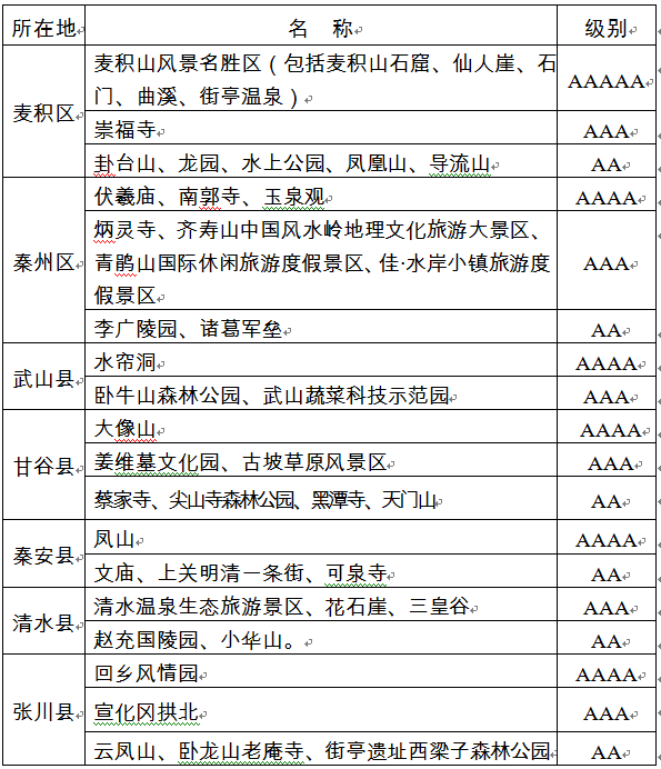 天水市恢復(fù)開放的國家A級旅游景區(qū)名單