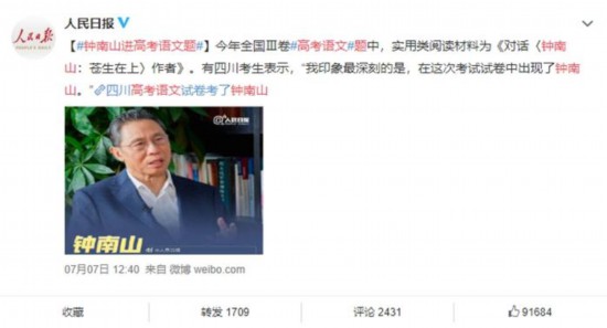 不過,他沒想到,今年全國(guó)Ⅲ卷高考語(yǔ)文題中,實(shí)用類閱讀材料為《對(duì)話〈鐘南山:蒼生在上〉作者》。有四川考生表示,“我印象最深刻的是,在這次考試試卷中出現(xiàn)了鐘南山。”