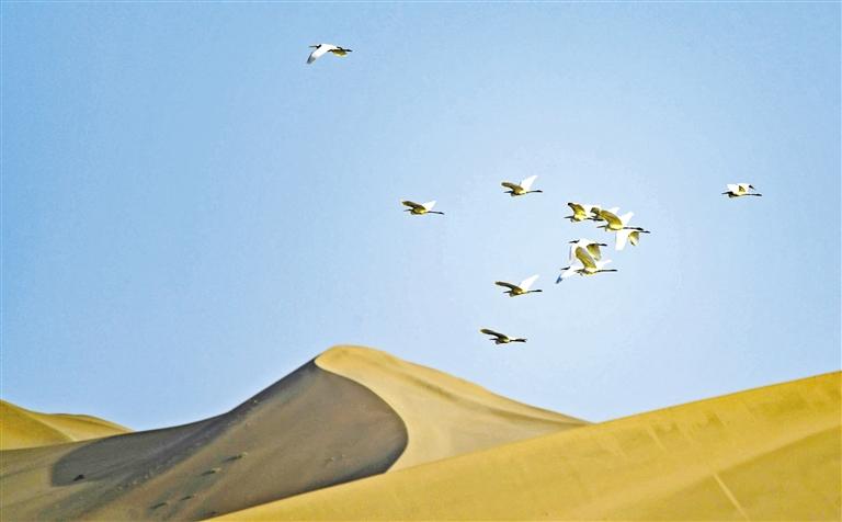 10月上旬,鳴沙山下大片水域吸引了大批的白鷺、白天鵝、鸕鶿、鷗鳥前來嬉戲、覓食。