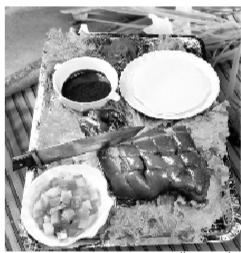 將蕨麻豬除去內(nèi)臟和頭蹄,然后內(nèi)涂調(diào)料,外裹泥巴,埋入無煙的牛糞火堆中炙烤,至泥呈褐黃色時(shí),豬毛隨泥巴脫落,即可放入大盤,配以佐料,用刀切割而食,肉嫩皮脆,鮮香無比。