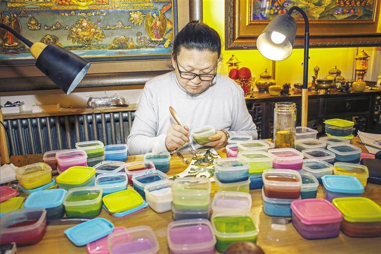 據(jù)李海明介紹,近年來,經(jīng)常會受邀代表甘肅省文創(chuàng)去省外參展,而每次展出的琺瑯文創(chuàng)產(chǎn)品都會受到來自各地的年輕人的好評。“有時會把不同人創(chuàng)作的壁畫、唐卡等擺在一起展出,總有很多年輕人在我的作品前逗留良久,這說明他們對我的琺瑯釉色彩是非常認可的。”