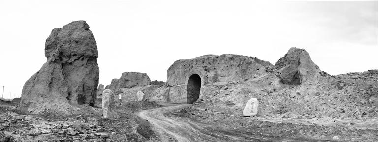 在鄉(xiāng)村公路邊,有人工擺放的怪石,上面有各種字體的書法石刻。這是山丹縣傾力打造的中國(guó)西部長(zhǎng)城文化書法石刻長(zhǎng)廊的一部分,這個(gè)石刻長(zhǎng)廊工程陳列了600多方名家書法石刻,到峽口古城前還有模擬太極八卦圖的展示……