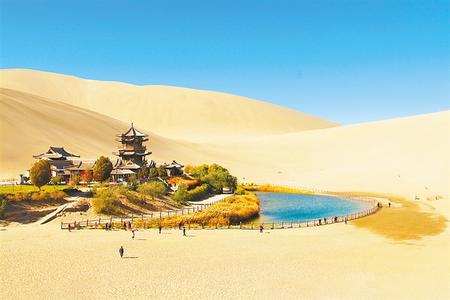 鳴沙山月牙泉是敦煌諸多自然景觀中的佼佼者,古往今來以“沙漠奇觀”著稱于世,被譽為“塞外風光之一絕”。月牙泉、莫高窟九層樓和莫高窟藝術(shù)景觀融為一體,是敦煌城南一脈相連的“三大奇跡”,成為中國乃至世界人民向往的旅游勝地。