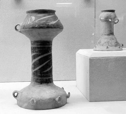 演奏時(shí),一手敲擊獸皮,另一只手蒙著后面小口,通過兩只手的敲擊開合,產(chǎn)生不同音節(jié),來實(shí)現(xiàn)演奏的效果。手的位置不同,方位不同,變換的角度不一樣,產(chǎn)生的音律就不一樣。它們就是古文獻(xiàn)中說的“以瓦為框”的土鼓,這些喇叭形的器物是先民用的土鼓,今天,我們把它們稱為彩陶鼓。