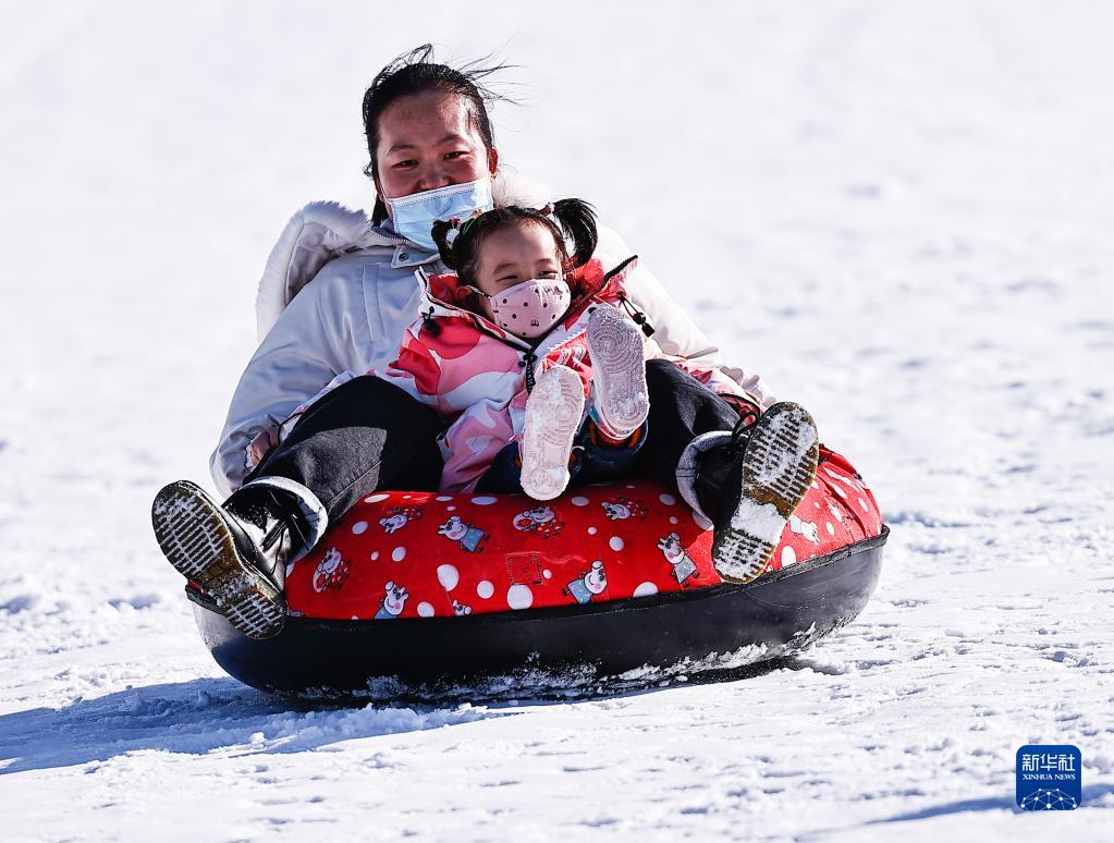 2月19日,市民在寧夏銀川市閱海滑雪場滑雪圈。