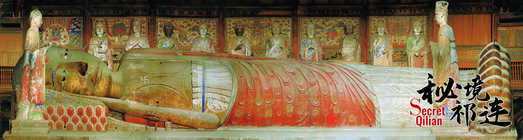 最后讓我們?nèi)グl(fā)現(xiàn),金張掖的神秘色彩,走進始建于1098年的大佛寺。大佛殿內(nèi)塑有釋迦牟尼涅槃臥像,佛身長34.5米,游客可以虔誠地在他身旁挪動腳步,體會宏大與渺小的強烈對比。