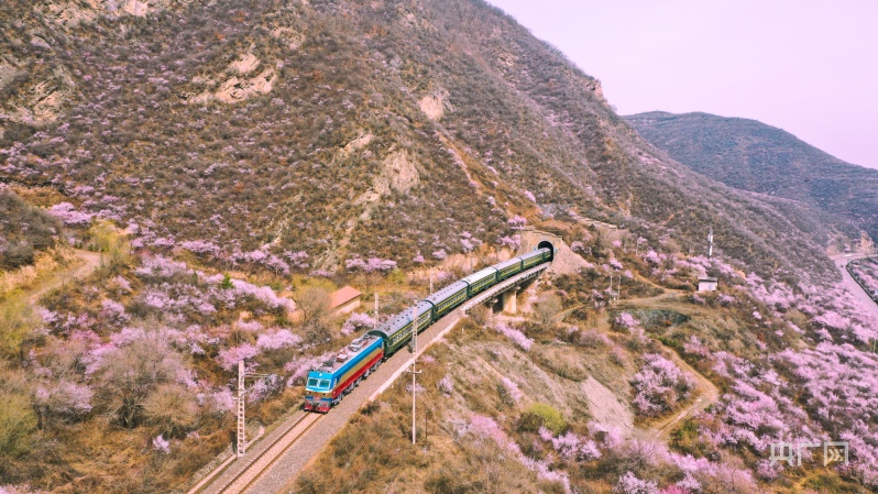 央廣網(wǎng)蘭州4月2日消息 (記者 邸文炯 通訊員 王紅剛 孫淑霞)近日,甘肅省崇信縣峽門寶中鐵路華亭市安口窯站附近的山上桃花盛開,花香四溢、如煙似霞?;疖噺纳街械乃淼来┬卸^,駛向一片春光燦爛。