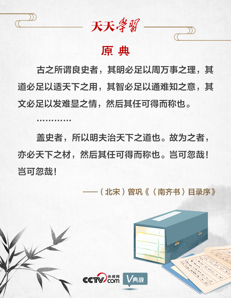 《〈南齊書〉目錄序》是曾鞏為“二十四史”之一的《南齊書》所寫的一篇序文,體現(xiàn)了曾鞏的史學研究價值取向。文章圍繞著“良史(優(yōu)秀的史官)”二字展開。曾鞏認為,“古之所謂良史者,其明必足以周萬事之理,其道必足以適天下之用,其智必足以通難知之意,其文必足以發(fā)難顯之情”。曾鞏在唐代史學家劉知幾“史才三長(才、學、識)”基礎上,將“良史”的標準引申為四點:明、道、智、文。其中,文、明、智相當于才、學、識,而“道”則是曾鞏的發(fā)展,并被擺在核心位置。曾鞏指出,“蓋史者,所以明夫治天下之道也。故為之者,亦必天下之材”。曾鞏認為,史書要闡明治國安邦的法則和規(guī)律,因此史家必須是兼具明、道、智、文的“天下之材”。他提出史家要發(fā)揮史學經(jīng)世致用的作用,修史要總結(jié)前朝興亡的經(jīng)驗教訓,為后世提供“法戒”。