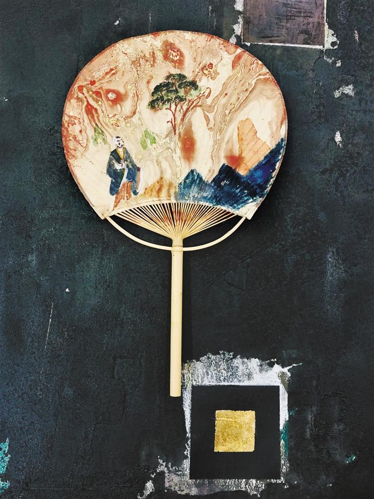 據(jù)劉志剛介紹,漆扇是使用漆藝中的“漂漆”技法,利用了漆不溶于水的特質,以點、甩、彈、劃等手法,在水面繪出圖案效果。這樣制作出的扇面,都是獨一無二的。