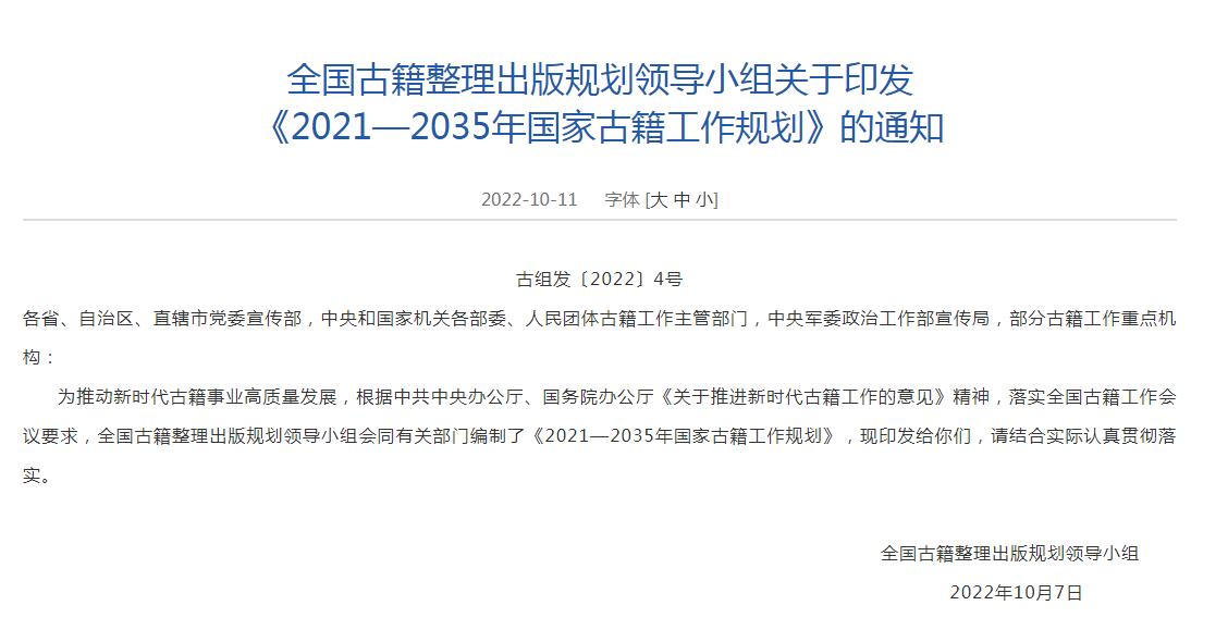 12日,據(jù)國家新聞出版署網(wǎng)站消息,全國古籍整理出版規(guī)劃領(lǐng)導(dǎo)小組會(huì)同有關(guān)部門編制了《2021—2035年國家古籍工作規(guī)劃》,其中提到,至2035年,古籍工作體制機(jī)制更加完善,以重大工程為引領(lǐng),加強(qiáng)古籍工作全局性謀劃,重點(diǎn)實(shí)施 《永樂大典》、敦煌文獻(xiàn)系統(tǒng)性保護(hù)整理出版工程等。