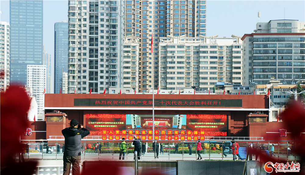 蘭州市東方紅廣場(chǎng),許多市民駐足路邊,通過大屏幕收看中國(guó)共產(chǎn)黨第二十次全國(guó)代表大會(huì)盛況。