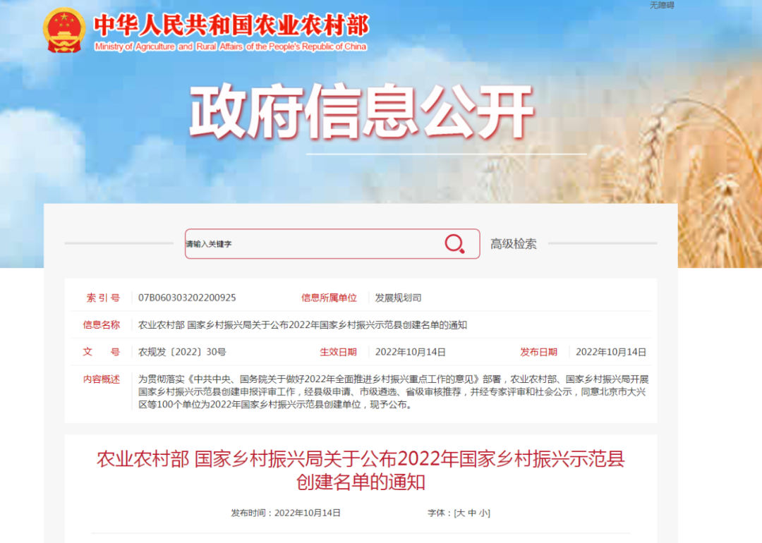 農業(yè)農村部、國家鄉(xiāng)村振興局開展的國家鄉(xiāng)村振興示范縣創(chuàng)建申報評審工作近日完成,北京市大興區(qū)、河南省蘭考縣、四川省眉山市東坡區(qū)等100個單位為2022年國家鄉(xiāng)村振興示范縣。其中甘肅省會寧縣、民勤縣、臨澤縣三地上榜。