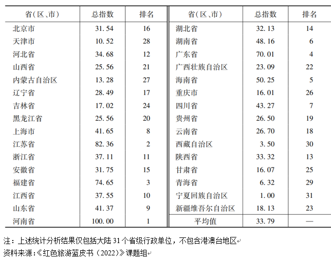 近日,北京第二外國語學院旅游科學學院與社會科學文獻出版社共同發(fā)布了紅色旅游藍皮書《中國紅色旅游發(fā)展報告(2022)》(以下簡稱《藍皮書》)。《藍皮書》指出,中國紅色旅游發(fā)展水平持續(xù)提升,31個省級行政單位(不含港澳臺地區(qū))的紅色旅游發(fā)展指數(shù)排名中,位列前十的依次為河南省、江蘇省、福建省、廣東省、海南省、湖南省、四川省、上海市、山東省、江西省。
