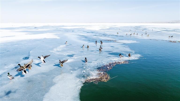 中國甘肅網(wǎng)2月3日訊 據(jù)蘭州晚報報道(通訊員 李永華 魏生明 記者 高慧霞 攝)2月2日,位于金塔縣的解放村水庫,越冬候鳥綠頭鴨、赤麻鴨成群結隊。隨著金塔縣生態(tài)環(huán)境的持續(xù)改善和好轉(zhuǎn),近幾年過境候鳥數(shù)量持續(xù)升高,每年冬天都有綠頭鴨、赤麻鴨等鳥類遷徙到解放村水庫等濕地越冬。