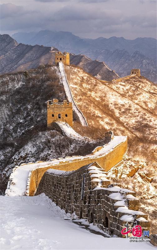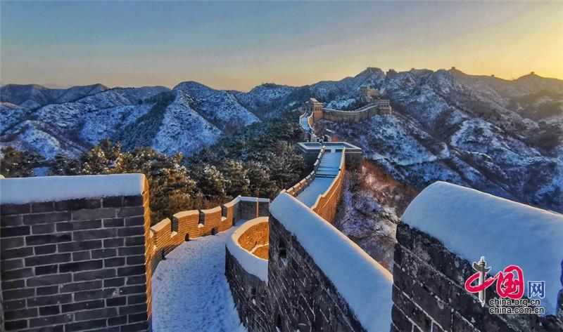 皚皚白雪覆蓋長(zhǎng)城內(nèi)外,銀裝素裹金山嶺氣勢(shì)磅礴。