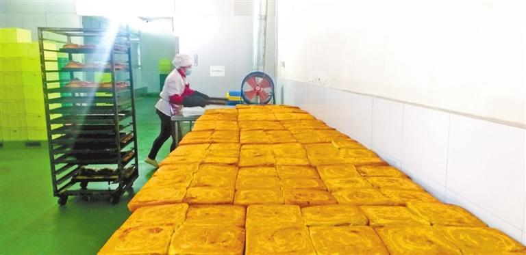 “揉面、搟面、抹餡料……”手工制作線上一位大姐告訴記者:“目前我們有手工生產(chǎn)和全自動(dòng)生產(chǎn)兩條線,分別生產(chǎn)千層餅傳統(tǒng)面點(diǎn)和玫瑰餅等新型糕點(diǎn)。傳承祖上燒餅制作技藝,工人們要在前一晚和好面,面團(tuán)經(jīng)過一夜的醒發(fā)后,天剛亮再交由經(jīng)驗(yàn)老到的師傅打堿,揉面、搟面,涂抹苦水玫瑰醬、胡麻顆粒、香豆粉、姜黃粉等餡料,卷制成型,在千層餅正面撒上芝麻,就可以上烤箱了,大約每天上午10點(diǎn)前烘烤好的千層餅會(huì)送往永登各銷售點(diǎn)。”