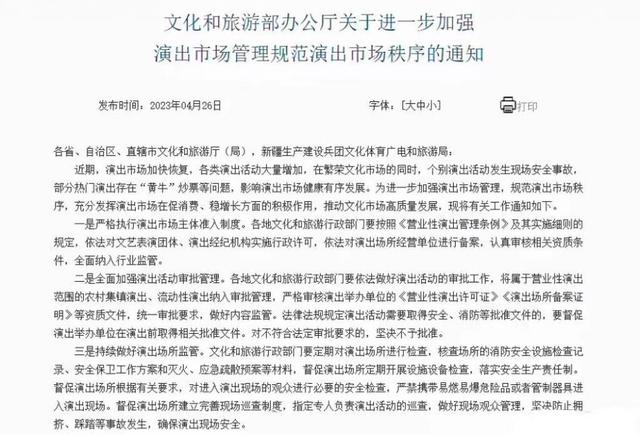 近日,文旅部辦公廳發(fā)布《文化和旅游部辦公廳關于進一步加強演出市場管理規(guī)范演出市場秩序的通知》。通知提到,對臨時搭建舞臺、看臺的演唱會、音樂節(jié)等大型演出活動,文化和旅游行政部門要做好演出現(xiàn)場監(jiān)管,查驗演出舉辦單位的演出批準文件及相關手續(xù),核驗演員信息及演出節(jié)目內(nèi)容,嚴禁擅自變更演員及演出內(nèi)容,嚴禁假唱、假演奏等違法違規(guī)行為。