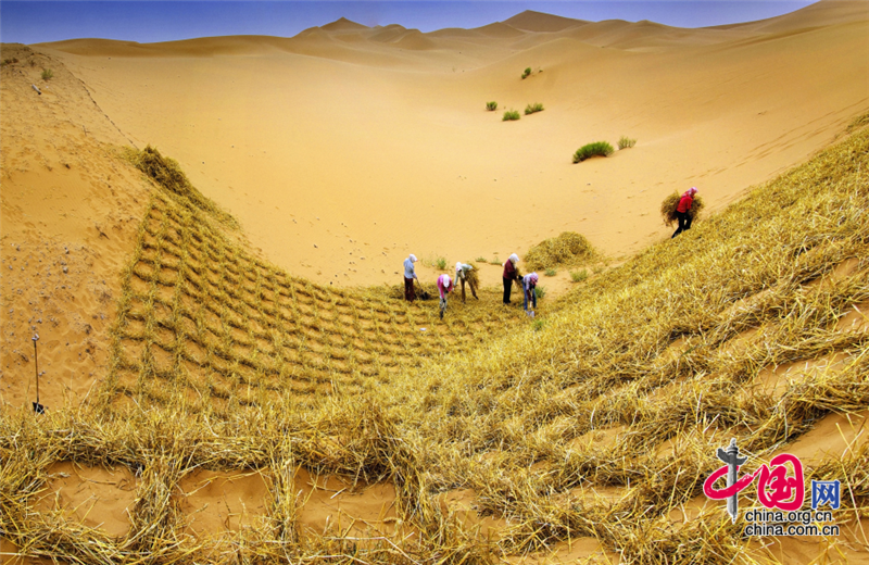 小小的“麥草方格”不僅阻止了流沙,防止了荒漠化,還加速了當(dāng)?shù)亟?jīng)濟(jì)的發(fā)展。“麥草方格”固沙法即:將廢棄的麥草呈方格狀鋪在沙面上,然后用鐵鍬軋進(jìn)沙中,留麥草的三分之一或一半立在四周,并在方格中植入治沙人經(jīng)九次試驗(yàn)成功培育出的花棒、檸條等沙生植物,腐爛干枯的麥草還作為肥料滋養(yǎng)植物的生長(zhǎng)。