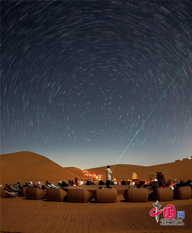 在沙漠區(qū),游客晨觀大漠日出,昏賞沙海夕陽(yáng),夜晚宿在星星酒店,感受躺在床上看星星的奇妙體驗(yàn),在星咖啡手工制作星星原木版畫,在五行沙療室滋養(yǎng)生命的每一個(gè)細(xì)胞,在觀星谷跟著星空講師春看獅子座、夏觀銀河、秋尋仙女座、冬追獵戶座,期待與一場(chǎng)流星雨的不期而遇。