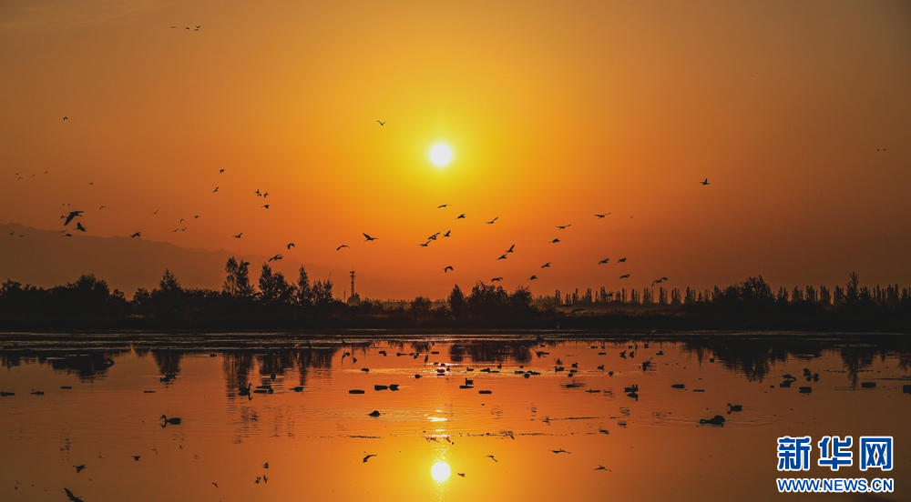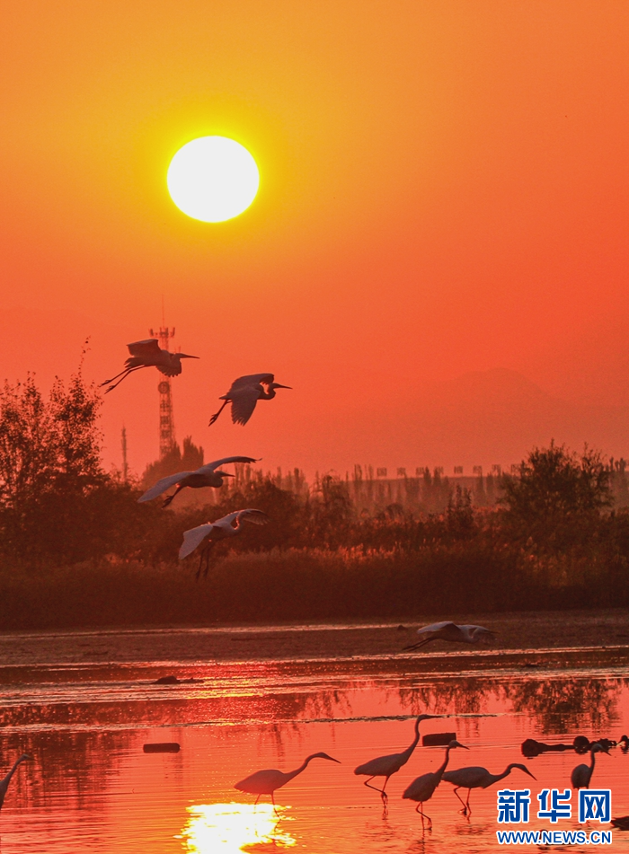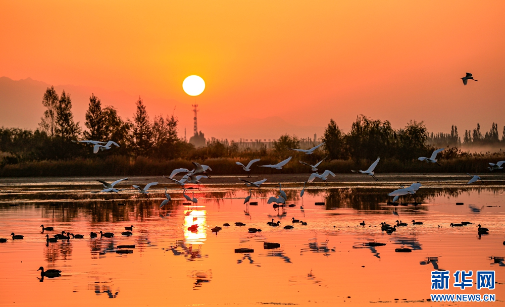 近日,在甘肅省張掖國家濕地公園,成群的白鷺迎著朝陽悠然自得地飛翔、覓食、嬉戲,構(gòu)成了一幅朝陽伴鷺飛的美麗畫卷。新華網(wǎng)發(fā)(陳禮 攝)