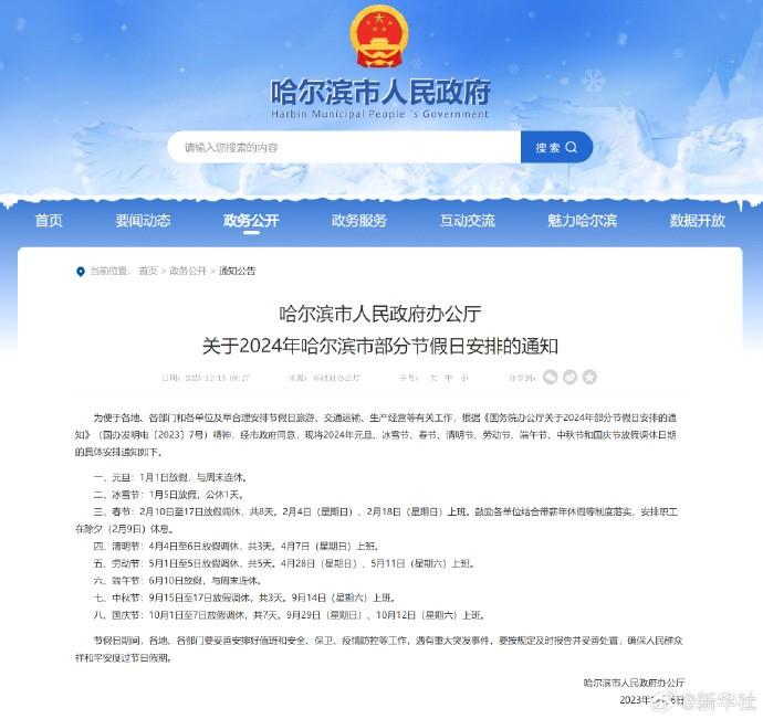 1月5日對(duì)哈爾濱人來說是一個(gè)特別的假期。據(jù)《哈爾濱市人民政府辦公廳關(guān)于2024年哈爾濱市部分節(jié)假日安排的通知》,冰雪節(jié)2024年1月5日(星期五)公休1天。明天,第40屆中國(guó)·哈爾濱國(guó)際冰雪節(jié)將盛大啟幕。