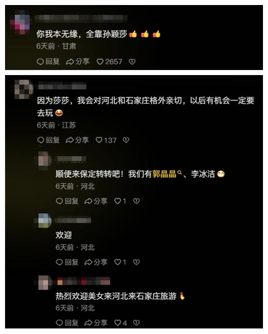 此前,多位網(wǎng)友向石家莊市文化廣電和旅游局官方賬號(hào)“石家莊文旅之聲”留言,表示想看國乒名將孫穎莎代言家鄉(xiāng)。公開資料顯示,出生于河北省石家莊市的孫穎莎在此開啟了乒乓球生涯。