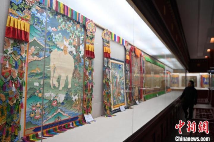 精品唐卡展廳展示甘南藏族唐卡國家級代表性傳承人交巴加布,及其父親的唐卡作品,常吸引游人“打卡”。(資料圖)中新社記者 九美旦增 攝