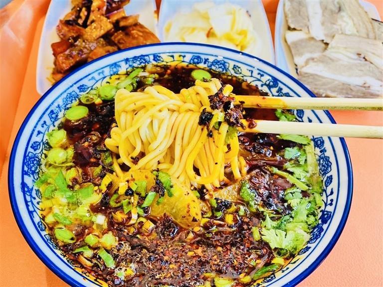 三月末的蘭州,天色尚未亮,蘭州城區(qū)千余家牛肉面館已開(kāi)門(mén)營(yíng)業(yè)。不少市民就來(lái)趕“頭鍋”,喚醒一天的精氣神。早上七八點(diǎn),面館的人越來(lái)越多,大家排著隊(duì),但并不需要等很久,稍等片刻牛肉面便出鍋了,熱氣騰騰,香氣四溢,吃起來(lái)更是回味無(wú)窮:面條筋道、湯汁濃郁。吃罷面,吹開(kāi)面湯上紅紅的辣椒油,喝一口湯,滿福滴很!