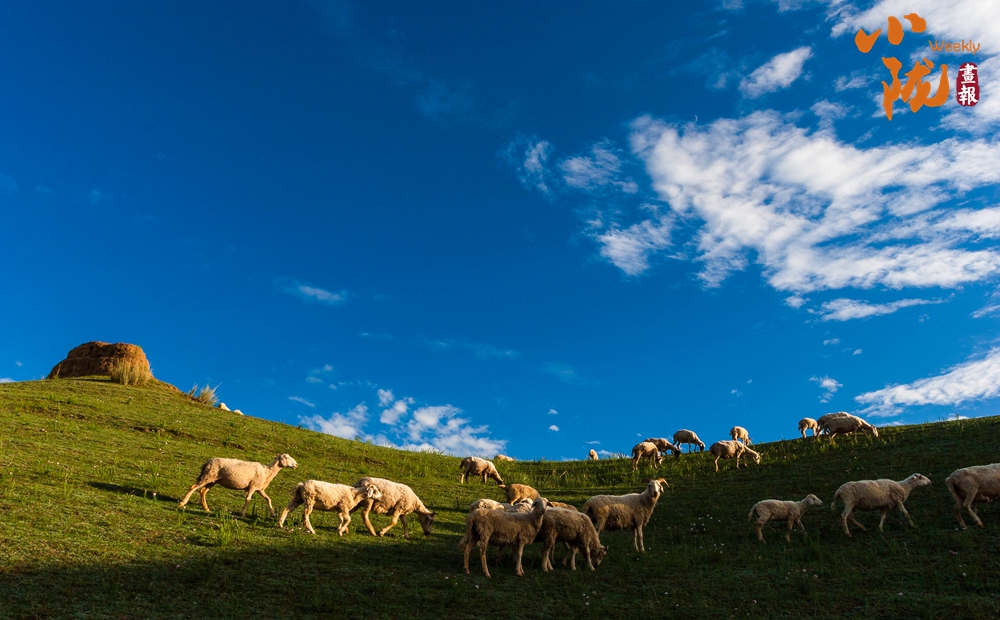 遠(yuǎn)處白云悠悠,百萬畝草原一望無垠,羊群點綴的大草原和那殘存的烽火臺相映成趣,呈現(xiàn)出一幅綠意盎然的詩意畫卷。