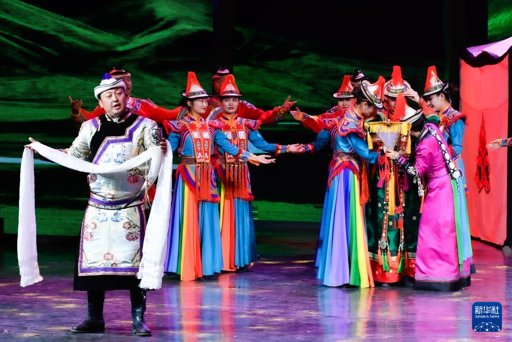 7月12日,張掖市肅南縣非物質(zhì)文化遺產(chǎn)保護(hù)傳承中心演員表演國家級非遺代表性項目裕固族婚俗。新華社記者 郎兵兵 攝