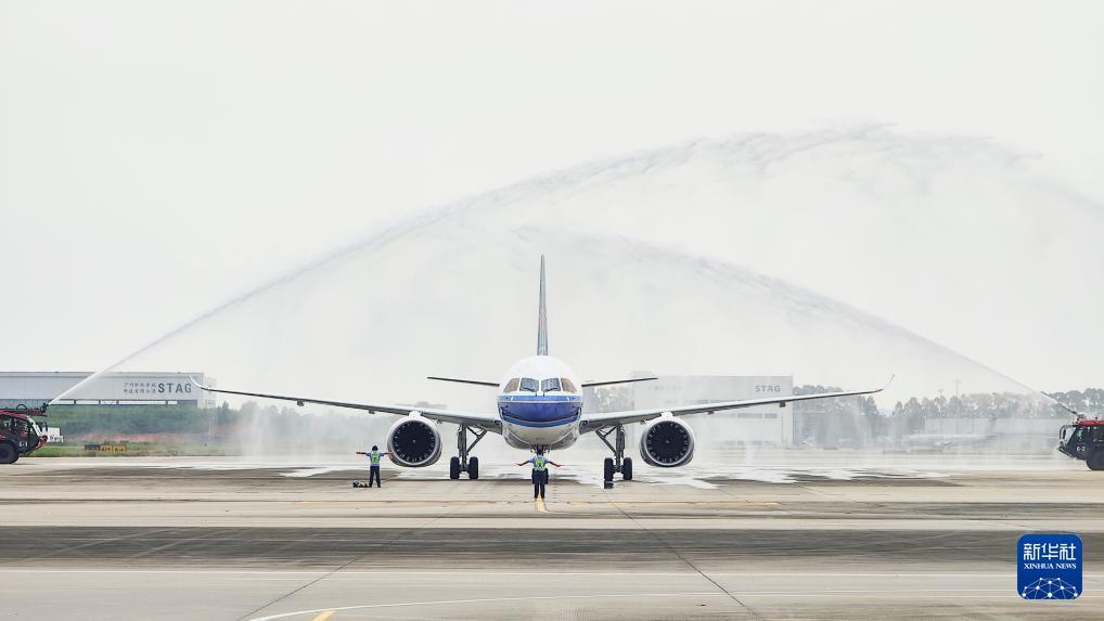 8月29日,南航首架C919國(guó)產(chǎn)大飛機(jī)在廣州白云國(guó)際機(jī)場(chǎng)緩緩穿過“水門”。新華社發(fā)