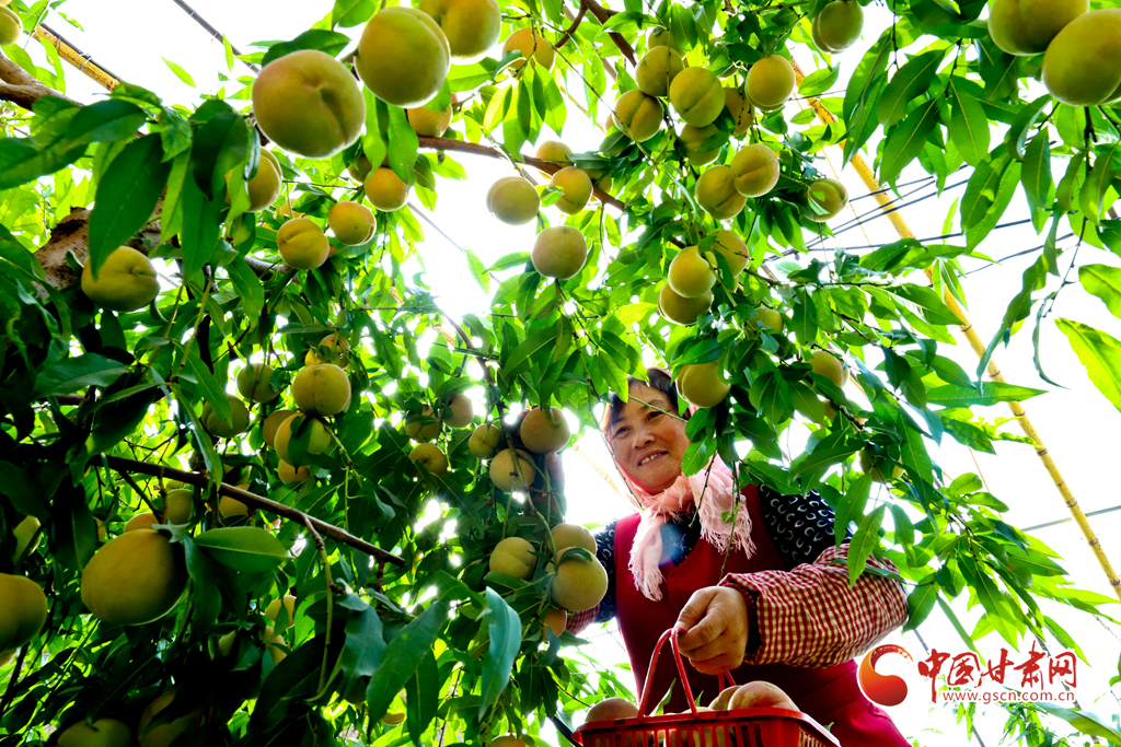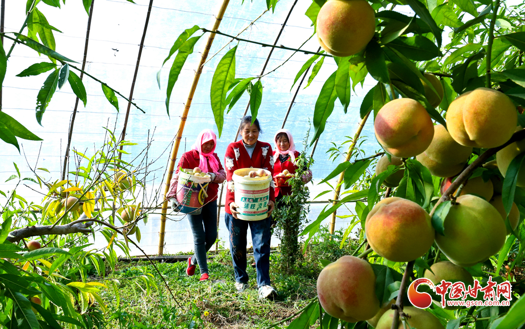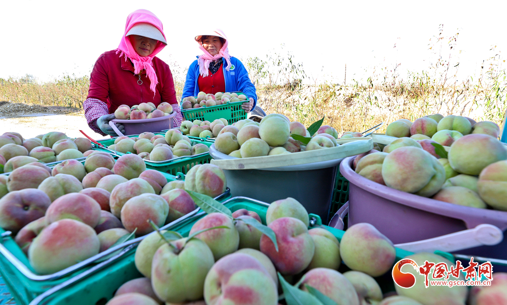 10月24日,在張掖市甘州區(qū)長(zhǎng)安鎮(zhèn)萬(wàn)通果蔬種植專(zhuān)業(yè)合作社“甘泉雪桃”種植基地大棚內(nèi),種植戶正在為甘肅蘭州和青海西寧的客戶采摘裝運(yùn)“甘泉雪桃”。