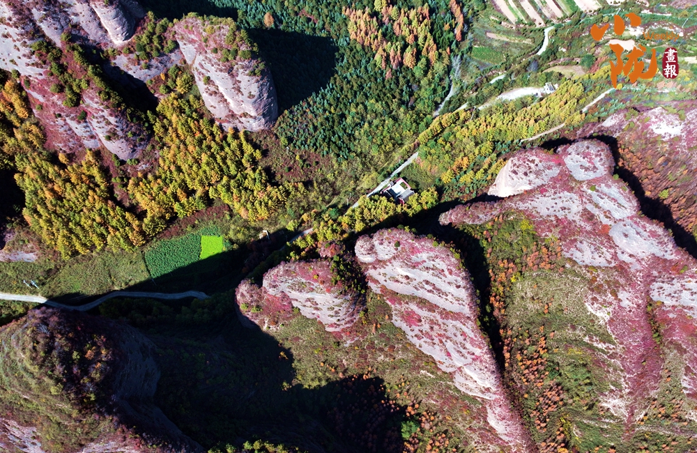 從空中俯瞰,牛頭山險(xiǎn)壑錯(cuò)綜,崖高十余丈,四面凌空,直立如削,呈現(xiàn)陽(yáng)剛挺拔之勢(shì)。