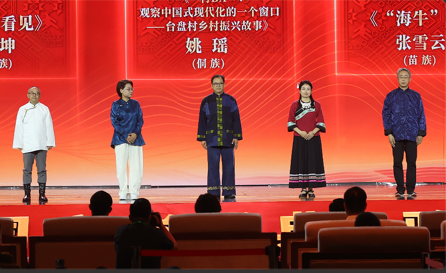 吉米平階、牛海坤、姚瑤、張雪云、周建新領取第十三屆全國少數(shù)民族文學創(chuàng)作駿馬獎報告文學獎。