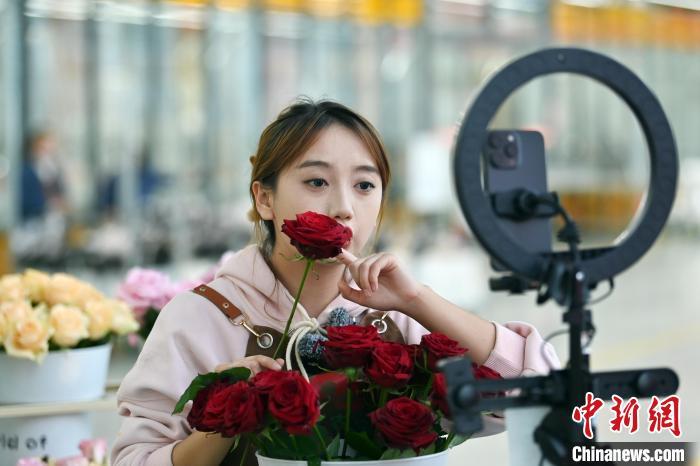 花瓣自帶絲絨感的“娜歐米”、文藝范兒十足的“紫霞仙子”、仙氣滿滿的“洛神”玫瑰……走進(jìn)鮮花港內(nèi),濃郁的玫瑰花香撲鼻而來。來自甘肅甘南藏族自治州夏河縣的鮮花港工作人員南吉卓瑪正在給玫瑰花打捆包裝。