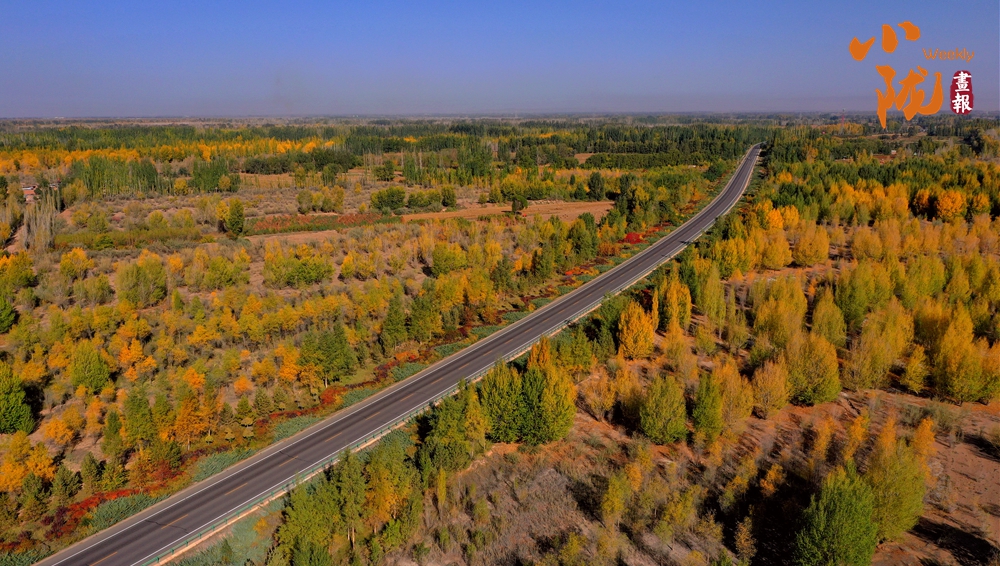 公路沿線成片的五彩林艷麗迷人,與藍天、荒漠共同勾勒出一幅色彩動人的生態(tài)畫卷。