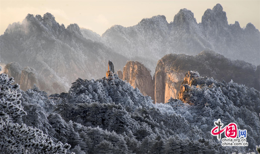 11月25日夜,安徽黃山風(fēng)景區(qū)迎來(lái)入冬首場(chǎng)降雪。26日,雪后初霽,五百里黃山銀裝素裹、分外妖嬈。山峰、奇松、怪石在朝陽(yáng)的關(guān)愛(ài)下披上了一層金色的外衣。松林相間雪花層疊,熠熠生輝,翠色與銀白交織,宛如瓊枝玉樹,讓人流連忘返。