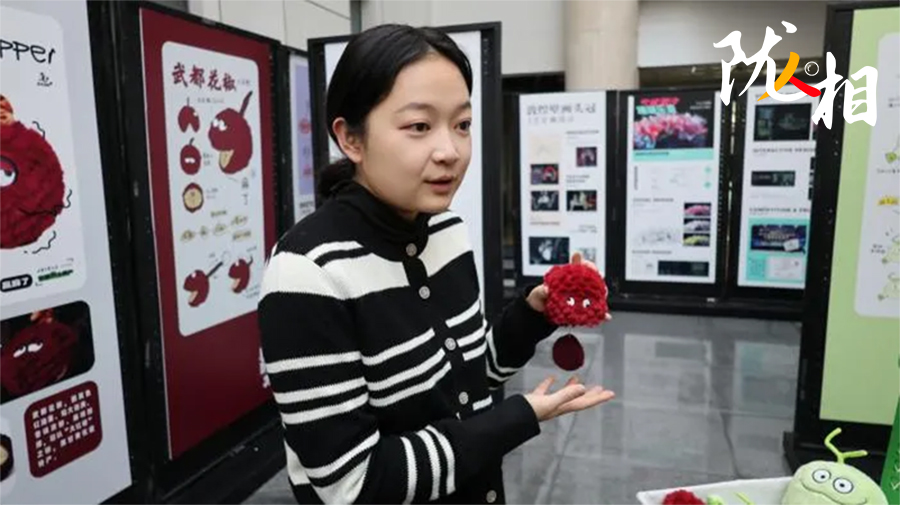 她拿起一只文創(chuàng)玩偶,輕輕拉起玩偶頂部蜷縮的細(xì)柄,這只紫紅色、毛茸茸的花椒玩偶立刻“嗡嗡”震動(dòng)起來?;ń肺队X上的麻就這樣傳遞到手上,精妙的構(gòu)思,令大家會(huì)心一笑。