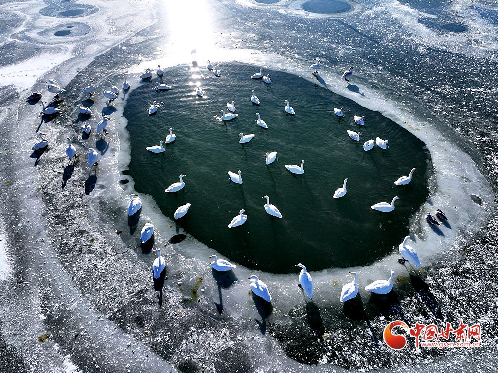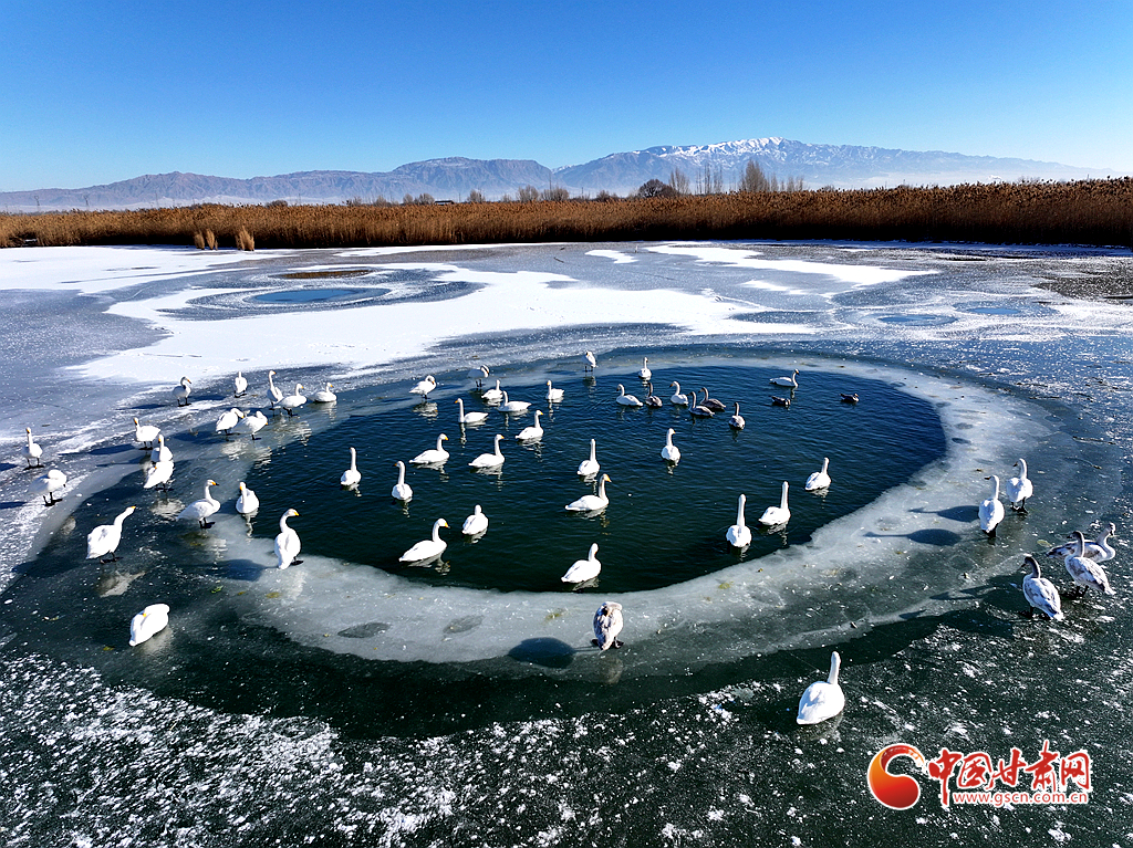 近日,在甘肅省張掖國家濕地公園,成群的越冬天鵝在冰封的湖面上悠然覓食、嬉戲,構(gòu)成了一幅動人的生態(tài)畫卷,成為冬日里一道尤為引人注目的風(fēng)景線。