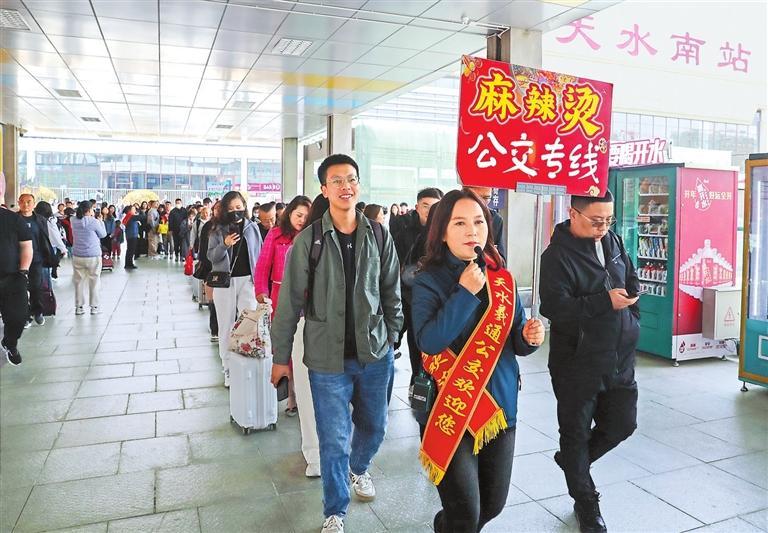 2024年4月3日,志愿者在天水南站引導(dǎo)游客乘坐免費(fèi)的“麻辣燙公交專線”。新甘肅·甘肅日報記者 高檣